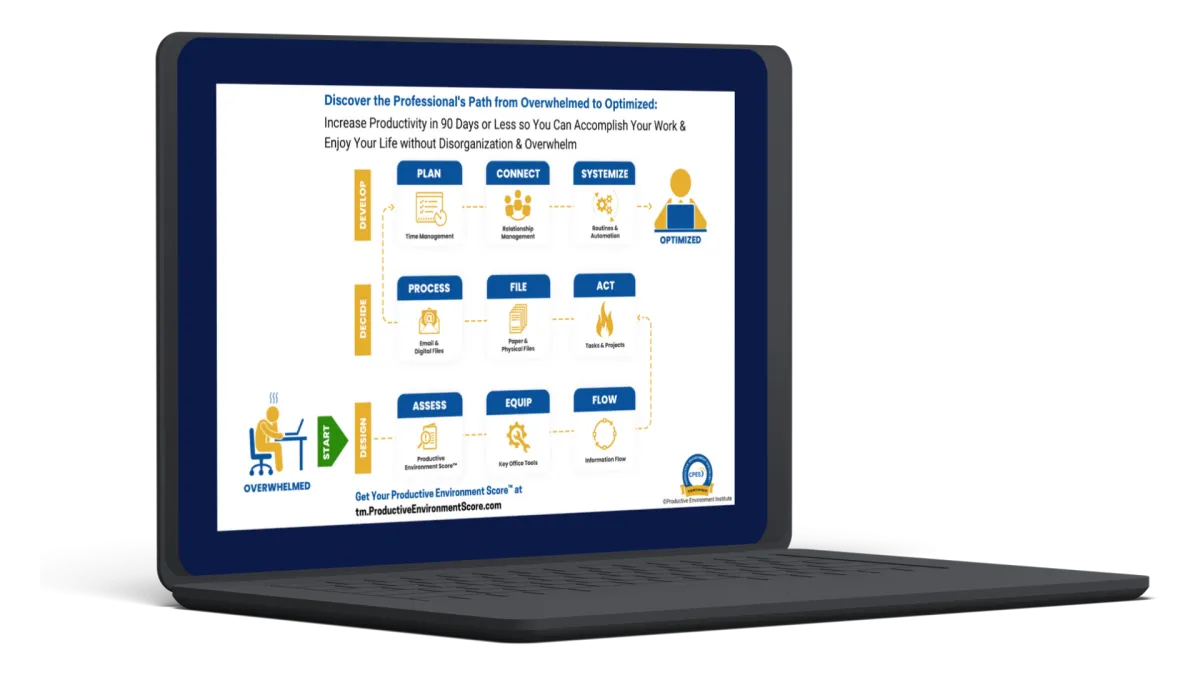 As a Certified Productive Environment Specialist™, I help Small Business Owners increase productivity in 90 days or less so they can go from overwhelmed to optimized and make more money without disorganization and overwhelm.
